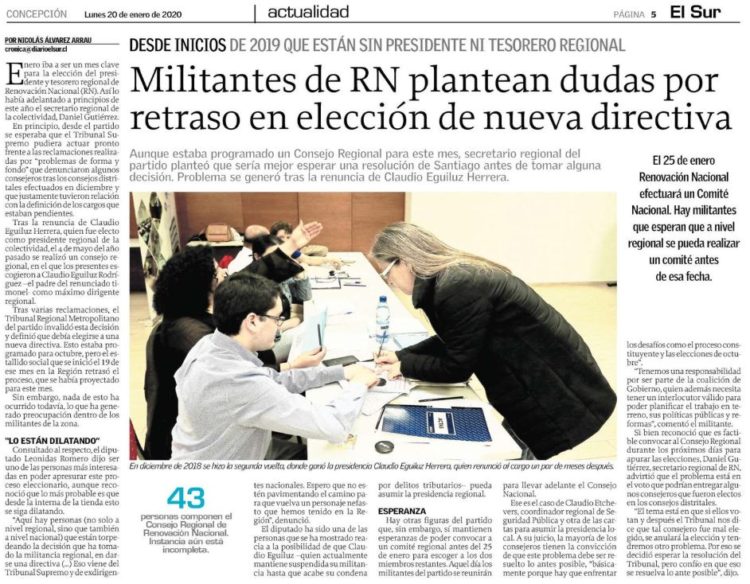 Militantes de RN plantean dudas por retraso en elección de nueva directiva/ El Sur, pag. 5, 20-01-2020
