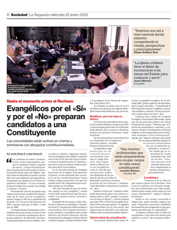 Evangélicos por el «Sí» y por el «No» preparan candidatos a una Constituyente/La Segunda, pág. 6, 22-01-2020