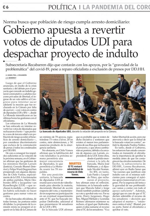Gobierno apuesta a revertir votos de diputados UDI para despachar proyecto de indulto/El Mercurio, 04-04-2020, p C6