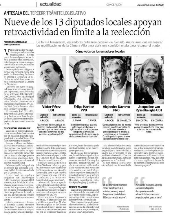 Nueve de los 13 diputados locales apoyan retroactividad en límite a la reelección/ Diario El Sur 28-05-2020, p.4