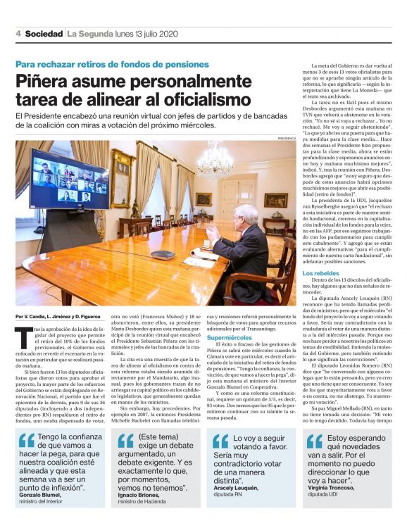 Piñera asume personalmente tarea de alinear al oficialismo / Diario La Segunda, 13-07-2020, p.04