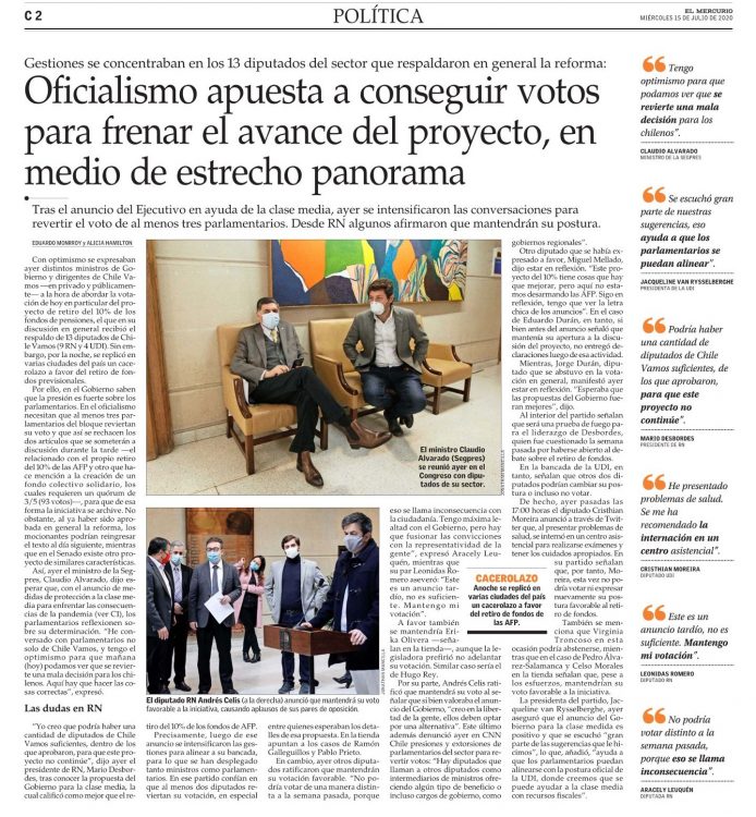 Oficialismo apuesta a conseguir votos para frenar el avance del proyecto, en medio de estrecho panorama/ Diario El Mercurio, 15-07-2020, p.C2