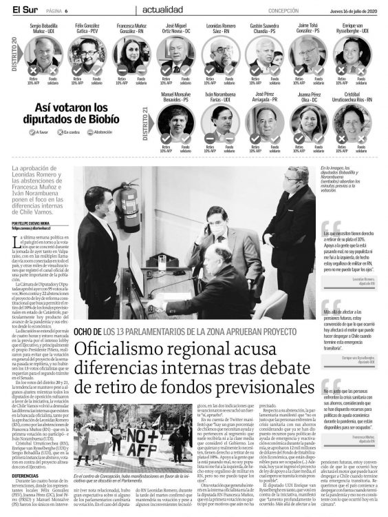 Oficialismo regional acusa diferencias internas tras debate de retiro de fondos previsionales/ Diario El Sur, 16-07-2020, p.06