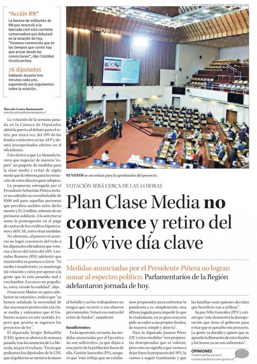 Plan Clase Media no convence y retiro del 10% vive día clave / Diario Concepción, 15-07-2020, p.04