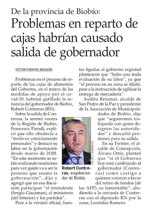 Problemas en reparto de cajas habrían causado salida de gobernador/ Diario El Mercurio, 28-07-2020, p.C3