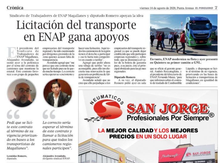 Licitación del transporte en ENAP gana apoyos/ Diario El Pingüino, 14-08-2020, p.07
