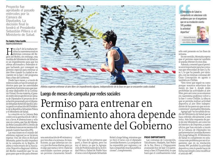 Permiso para entrenar en confinamiento ahora depende exclusivamente del Gobierno/ Diario El Sur, 19-10-2020, p.13