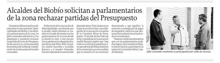 Alcaldes del Biobío solicitan a parlamentarios de la zona rechazar partidas del Presupuesto/ Diario El sur, 06-11-2020, p.04