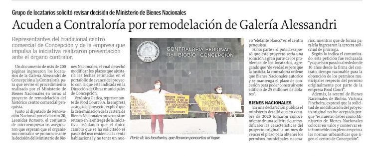 Concesionarias de proyecto Galería Alessandri recurren otra vez a Contraloría/ Diario El Sur, p.10, 28-08-2021